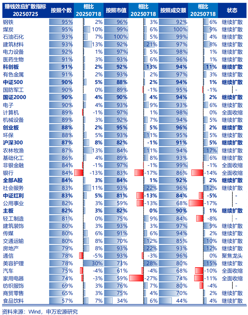 我们在7月12日发布的一周回顾与展望报告《市场已演绎出“牛市氛围”》中,初步讨论了“牛市氛围”。过去两周,市场行情在“牛市氛围”中演进,体现为高切低轮动行情也有弹性,市场向上弹性大,调整幅度小。本周,我们继续讨论“牛市氛围”的合理性:时间已经是牛市的朋友,这背后核心是时间是基本面改善和增量资金流入的朋友。随着时间的推移,基本面有效改善会渐行渐近,增量资金流入也可以期待。1. 中游制造从2026年中开始,本就会出现供给出清,固定资产增速低于名义GDP增速。反内卷只需实现“去资本开支”,就能使得中游制造资本开支负增长更深、更持续,进而使得供需格局容易改善的窗口延续更长时间。本轮行情有远期基本面改善支撑。25H2经济增长不及25H1 + 国内经济刺激力度无法满足最乐观者的预期,仍是基准假设。但在远期有困境反转预期的情况下,25H2经济验证承压可能只会带来短期波折。2. 居民全面增配权益需要A股赚钱效应累积量变到质变。现阶段,公募2020-21年新发行产品尚未解套,盈利客户占比也尚未回到历史中位附近。但赚钱效应累积正在加速,6月23日以来,基金重仓股指数上涨11%。居民增配权益的通道被打通的时间,可能明显提前。